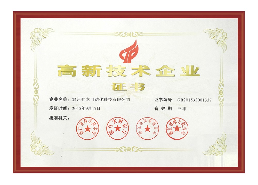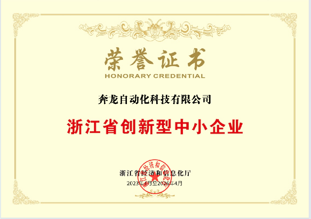 奔龍自動(dòng)化科技有限公司是一家自動(dòng)化系統(tǒng)集成技術(shù)為核心,專(zhuān)注數(shù)字化智能制造裝備的國(guó)家級(jí)高新技術(shù)企業(yè),成立于2008年,注冊(cè)資金5088萬(wàn)元,位于“中國(guó)電器之都”一-溫州市,2015年獲得“國(guó)家高新技術(shù)企業(yè)”證書(shū)、擁有國(guó)家專(zhuān)利160項(xiàng)+,軟件著作權(quán)26項(xiàng)+,先后獲得“浙江省科技型中小企業(yè)”“樂(lè)清市科技(創(chuàng)新)型企業(yè)”“樂(lè)清市專(zhuān)利示范企業(yè)”“重合同、守信用”誠(chéng)信企業(yè)”浙江省科學(xué)技術(shù)進(jìn)步獎(jiǎng)”、AAA級(jí)信用企業(yè)等榮譽(yù)。