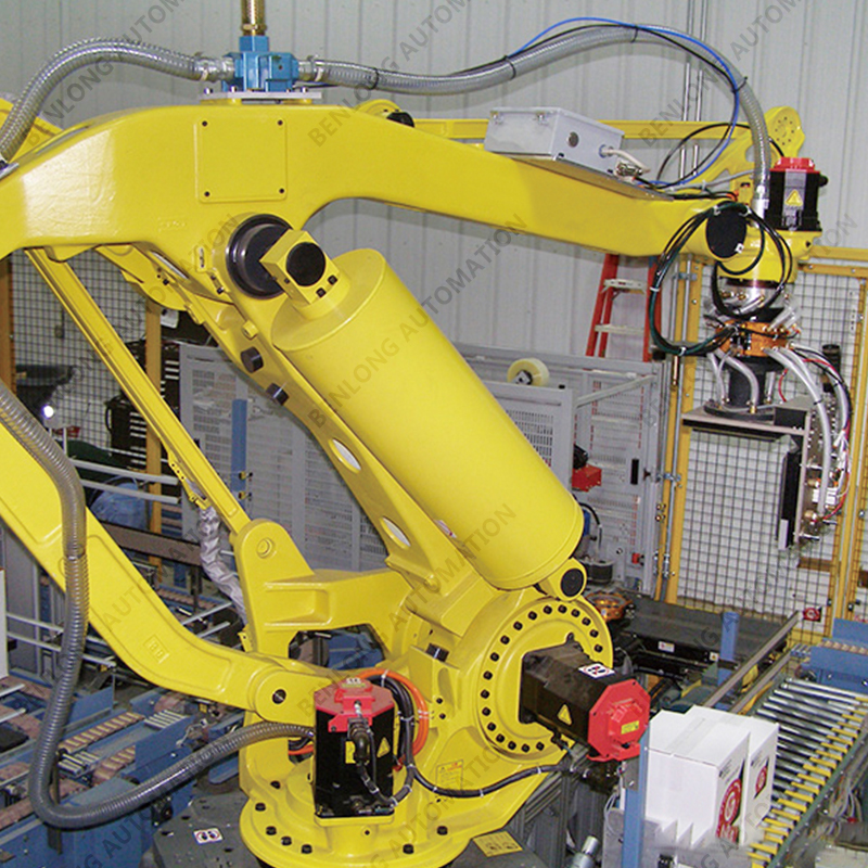 外箱自動(dòng)成型、中盒產(chǎn)品裝入外箱內(nèi)、外箱自動(dòng)貼標(biāo)簽、檢測(cè)、噴碼、封透明膠帶、捆扎帶、90°旋轉(zhuǎn)、下料碼垛、缺料報(bào)警等工序