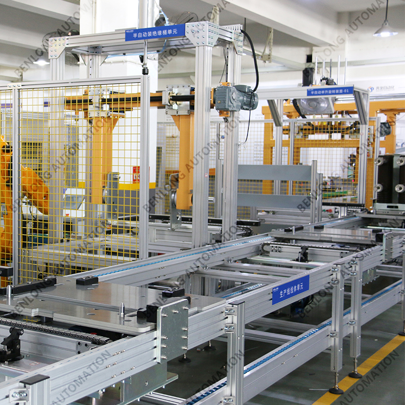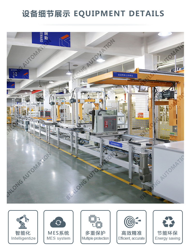 具有自動(dòng)AGV物流輸送、龍門架自動(dòng)上料、倍速鏈物流、絕緣筒裝配、滅弧室裝配、初調(diào)裝配、初調(diào)翻轉(zhuǎn)、機(jī)器人鎖螺絲、開距、超程、