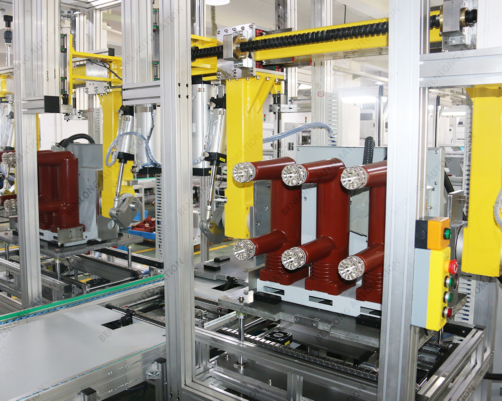 具有自動(dòng)AGV物流輸送、龍門架自動(dòng)上料、倍速鏈物流、絕緣筒裝配、滅弧室裝配、初調(diào)裝配、初調(diào)翻轉(zhuǎn)、