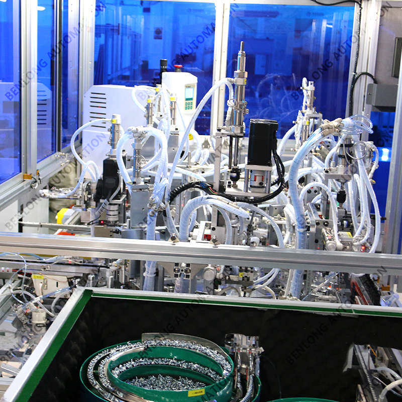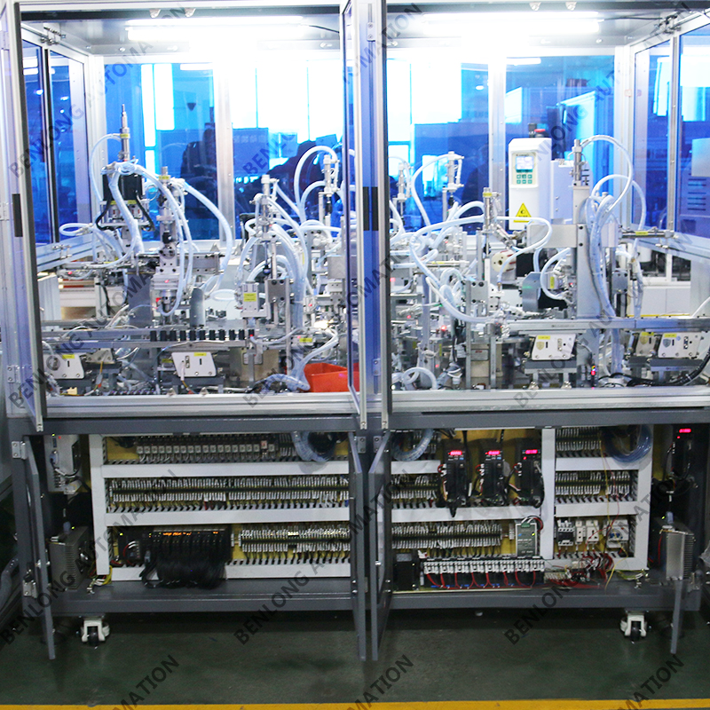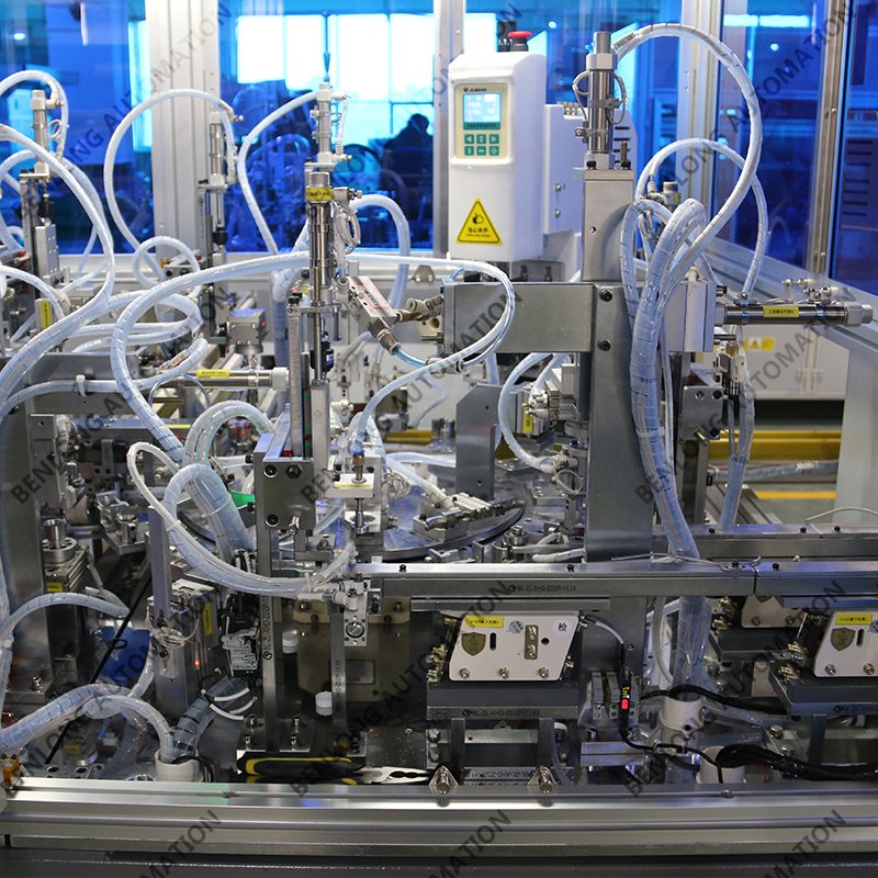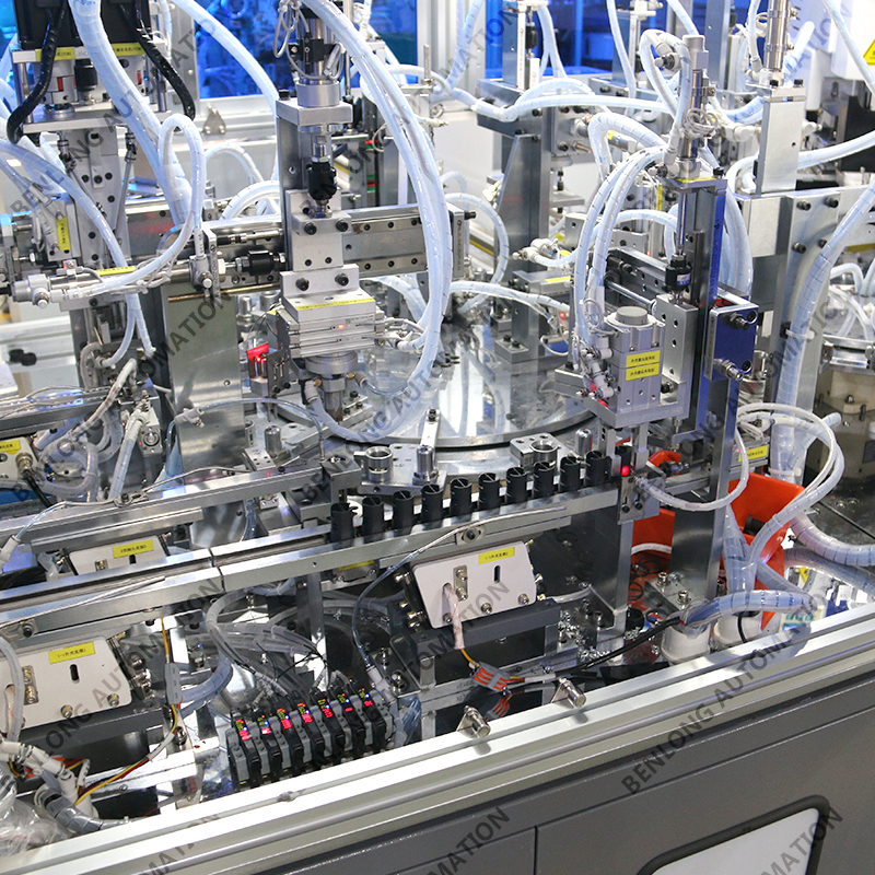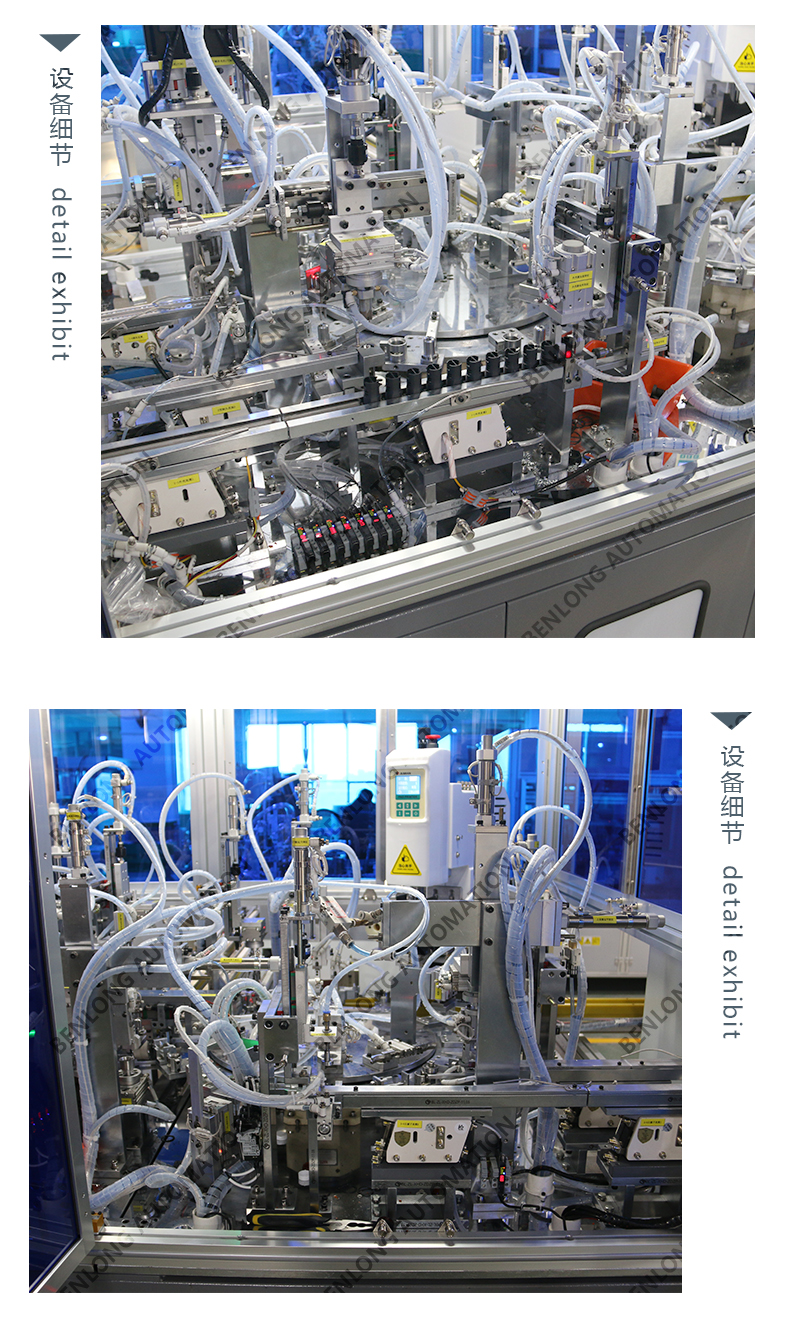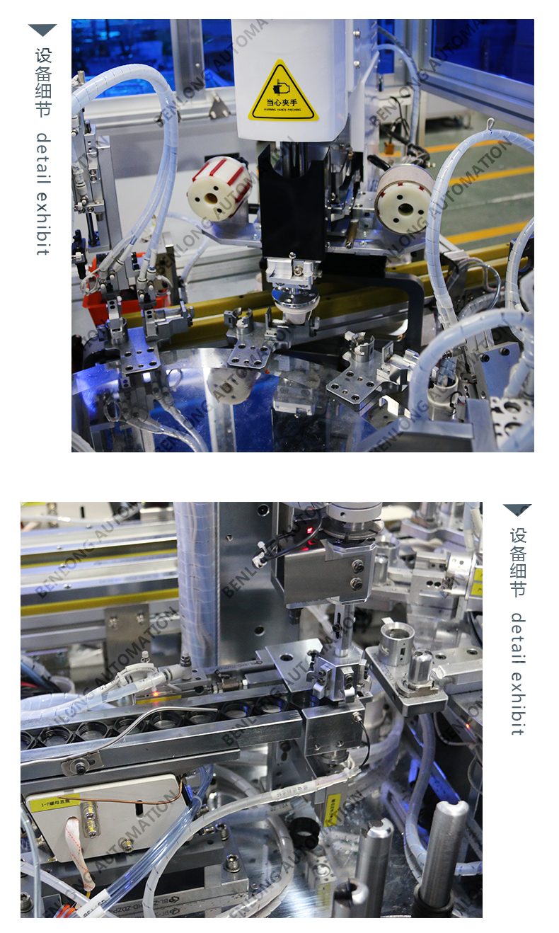 具有產(chǎn)品自動(dòng)上料、錫焊、裝帽蓋、裝膠圈、裝塑料螺母、鎖螺絲、移印、激光標(biāo)刻、檢測(cè)、合格不合格區(qū)分、包裝、